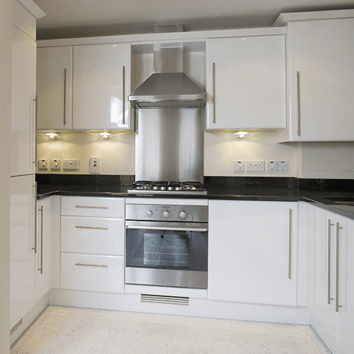 High gloss white furniture with black granite worktops